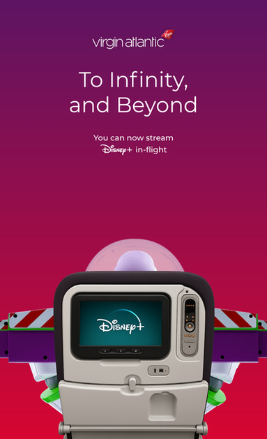 Task: Virgin Atlantic is collaborating with Disney+ to offer in-flight streaming. They’re looking for a creative way to announce the partnership through a static visual campaign for both social media and billboards.